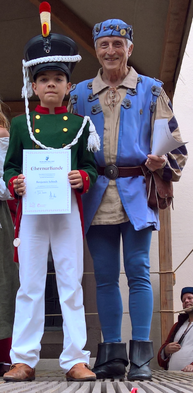 Zum ersten Mal gab es am Brettener Peter und Paul Fest eine Kinderehrung und sogleich war ein Sprössling der Historischen Bürgerwehr der Stadt Bretten mit unter den zu Ehrenden: der 12jährige Benjamin Schoch durfte für stolze 10 Jahre aktiver Teilnahme am Peter und Paul Fest eine Urkunde samt Medaille in Empfang nehmen.