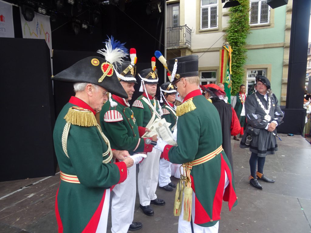 Bei der Begrüßung der Gäste auf dem Marktplatz zeichnete die Hist. Bürgerwehr Bretten einige Mitglieder für langjährige aktive Dienstzeit aus und ehrte die Sieger des Freischießens, welches am gleichen Morgen auf der Schießanlage des KKS Bretten ausgetragen wurde.