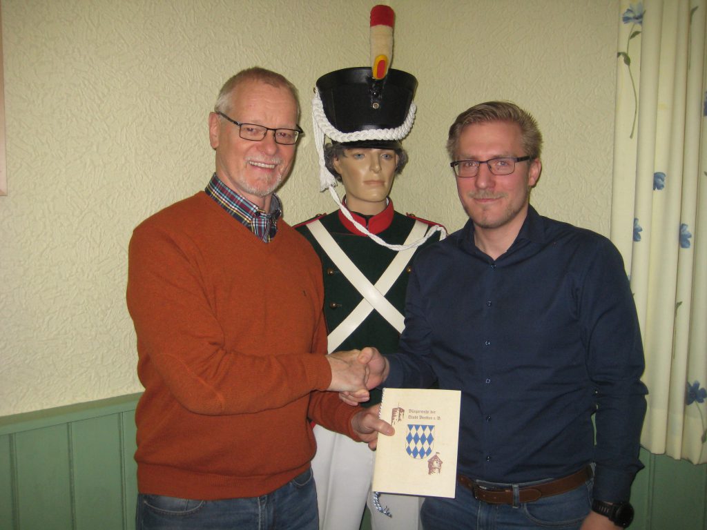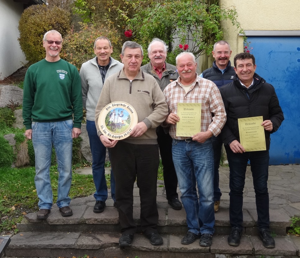 Bei der diesjährigen Mitglieder-Hauptversammlung der historischen Bürgerwehr Bretten  wurde der erste Vorsitzende Dieter Petri in seinem Amt bestätigt.  Zunächst berichtete er von einem erfolgreichen und arbeitsreichen Jahr, u.a. mit Satzungsänderung, Mitwirkung beim Stadtjubiläum und als Höhepunkt die Aufführung des Zapfenstreiches im Ettlingen Schlosshof bei der Verabschiedung des dortigen Kommandanten Paul Kolossa, der wenige Wochen danach leider viel zu früh verstarb. Doch auch die geselligen Veranstaltungen kamen nicht zu kurz, wie das beliebte Sommerfest, Ausflüge von Wander- und Motorradgruppe oder auch Fahrradtour zum Bensheimer Winzerfest. Mit 5 neuen, aktiven Mitgliedern konnte ein in den  letzten Jahren nicht dagewesener  Zuwachs verzeichnet werden. Der Kassenbericht von Schatzmeister Jürgen Huber zeigte zwar ein negatives Ergebnis, aufgrund der getätigten Investitionen war man trotzdem zufrieden. Bei  den Neuwahlen wurde neben Dieter Petri auch Kassier Jürgen Huber ohne Gegenstimme in seinem Amt bestätigt. Kassenprüfer für das laufende Jahr sind Günther Gropp und Helmut Kirchhoff. Bei den vorausgegangenen Abteilungswahlen wurden Thomas Rempfer und Joachim Kellermann wiedergewählt. Bevor der Spielmannszug die harmonisch verlaufende Versammlung beendete, wurde Thomas Rempfer  mit der Ehrenspange in silber für 20 Jahre aktive Dienstzeit von Vorstand Dieter Petri ausgezeichnet.