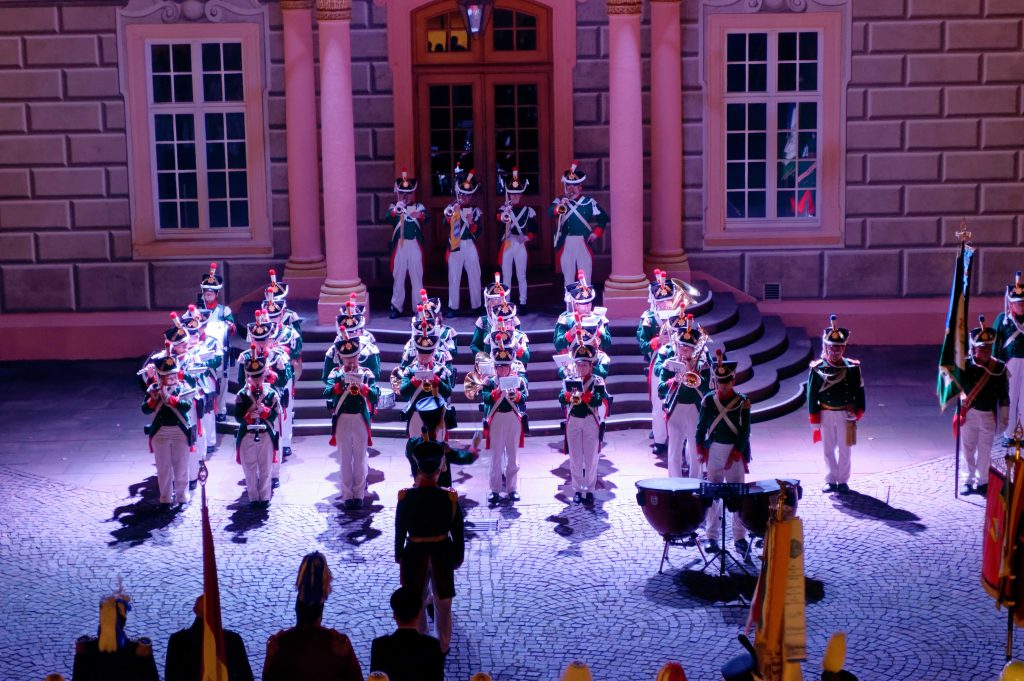 Es ist jedes Mal ein besonderes Ereignis , wenn der Musikzug der historischen Bürgerwehr Bretten den großen Zapfenstreich aufführt. So auch kürzlich im Innenhof des Ettlinger Schlosses. Grund war ein Kommandowechsel bei der Ettlinger Patenwehr. Mayor Paul Kolossa gab nach 32 Jahren das Ruder an seinen Nachfolger, Hauptmann Thilo Florl ab. Zu Ehren des scheidenden Kommandanten zelebrierte die Bretten Wehr unter der Federführung von Dieter Petri sowie der musikalischen Leitung von Tambour Jörg Schoch und Dirigent Andreas Frank vor der malerischen Kulisse des Schlosshofes den großen Zapfenstreich. Unter den zahlreichen Gästen waren auch Abordnungen des gesamten Landesverbandes zugegen, die voll des Lobes für die herausragende und stimmungsvolle Aufführung waren.