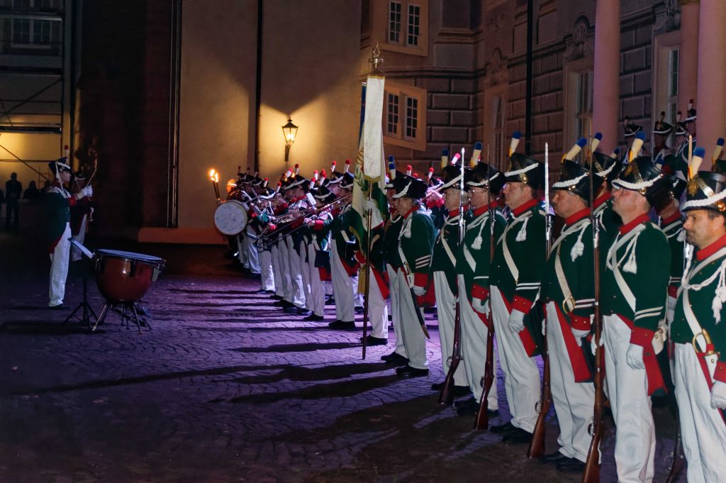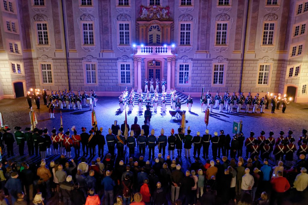 Es ist jedes Mal ein besonderes Ereignis , wenn der Musikzug der historischen Bürgerwehr Bretten den großen Zapfenstreich aufführt. So auch kürzlich im Innenhof des Ettlinger Schlosses. Grund war ein Kommandowechsel bei der Ettlinger Patenwehr. Mayor Paul Kolossa gab nach 32 Jahren das Ruder an seinen Nachfolger, Hauptmann Thilo Florl ab. Zu Ehren des scheidenden Kommandanten zelebrierte die Bretten Wehr unter der Federführung von Dieter Petri sowie der musikalischen Leitung von Tambour Jörg Schoch und Dirigent Andreas Frank vor der malerischen Kulisse des Schlosshofes den großen Zapfenstreich. Unter den zahlreichen Gästen waren auch Abordnungen des gesamten Landesverbandes zugegen, die voll des Lobes für die herausragende und stimmungsvolle Aufführung waren.